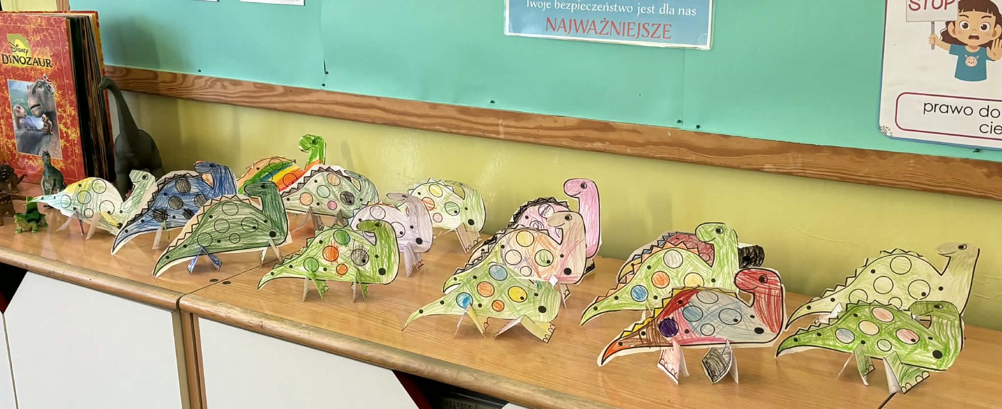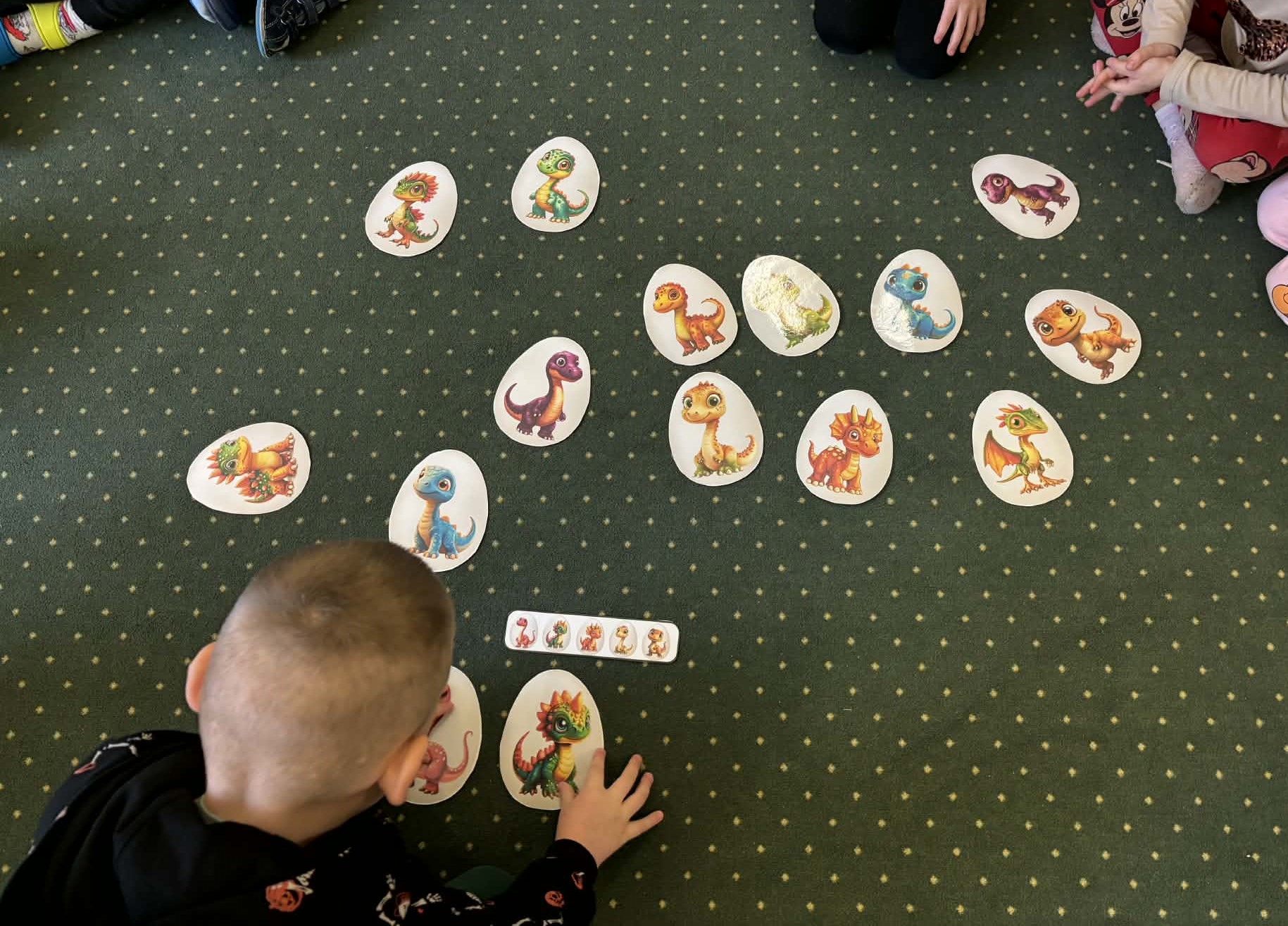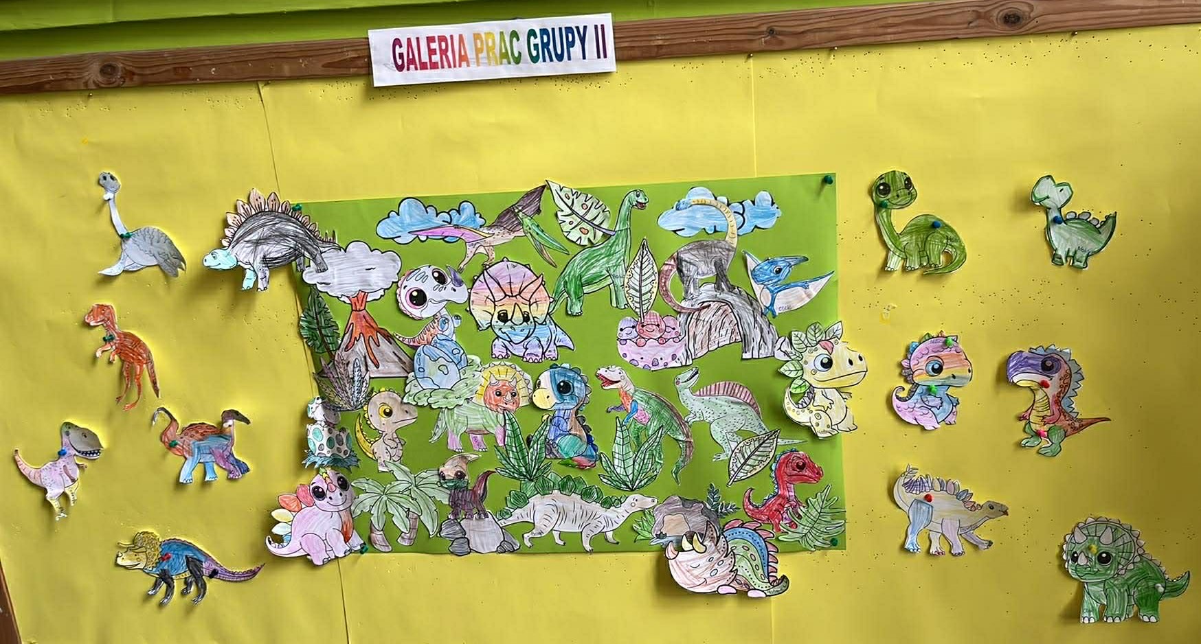W ostatnim tygodniu lutego zapoznaliśmy się z historią węgla kamiennego i jego właściwościami. Poznaliśmy nazwy wybranych dinozaurów, dopasowywaliśmy nazwy do danego dinozaura oraz nauczyliśmy się krótkiej rymowanki. Nie zabrakło wspólnych zabaw popołudniowych gdzie układaliśmy sekwencje z jajek dinozaurów, dopasowywaliśmy szkielety dinozaurów do odpowiedniego obrazka oraz słuchaliśmy piosenek o dinozaurach. Wykonaliśmy dinozaury z papieru, które udekorowały nasz kącik tematyczny, wykonaliśmy kartę pracy gdzie robiliśmy kuleczki z bibuły i przyklejaliśmy je w brakujących miejscach. Grupowo wykonaliśmy prace plastyczną "Świat dinozaurów", każdy z nas pokolorował wybranego przez siebie dinozaura i przykleił go na wybrane miejsce. W czwartek świętowaliśmy Dzień Dinozaura z tej okazji każdy z nas dostał drewnianą figurkę dinozaura i pomalował ją według własnego pomysłu.
