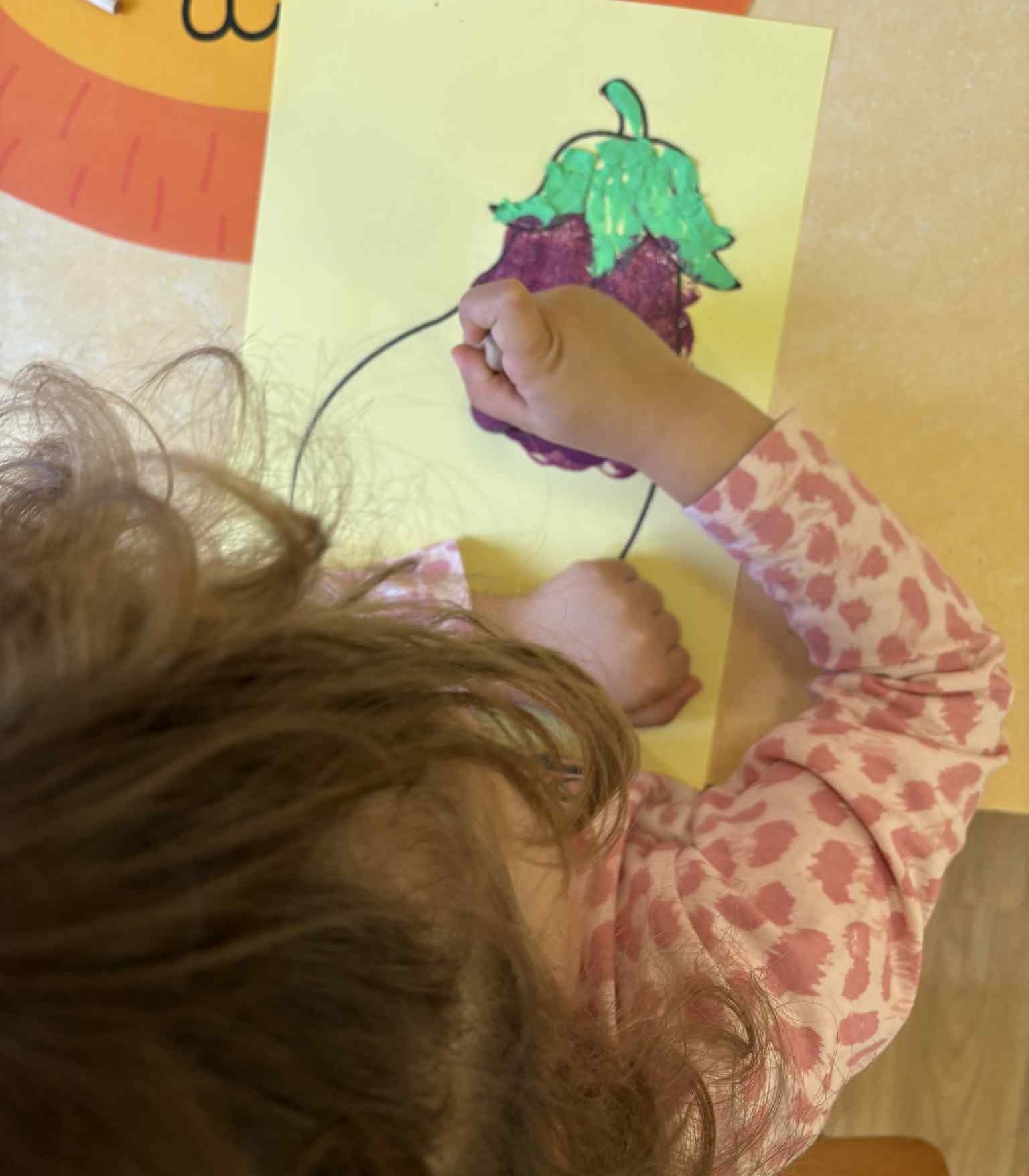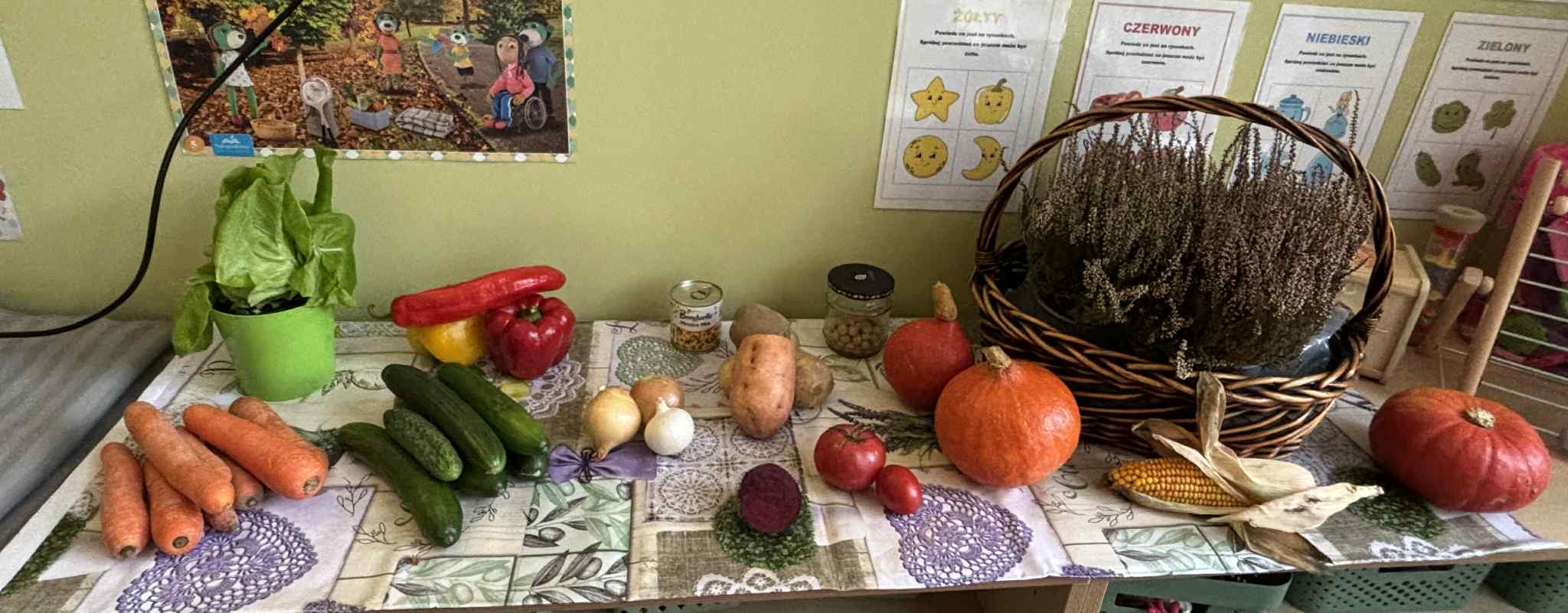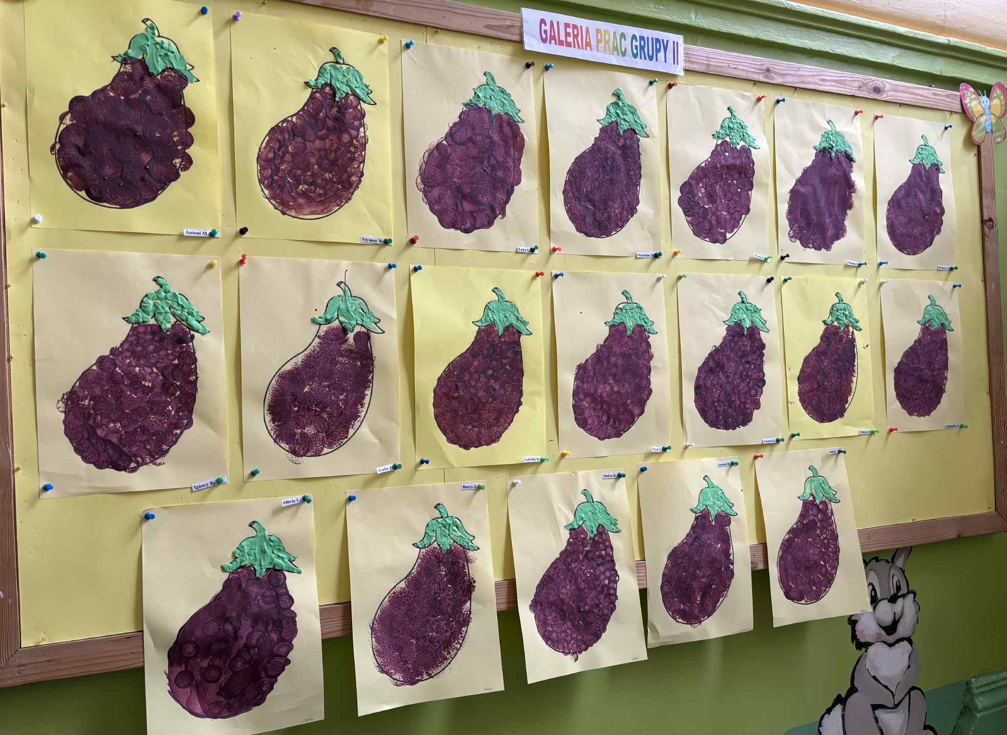W pierwszym tygodniu października w naszej grupie sporo się działo. Rozpoznawaliśmy i nazywaliśmy wybrane warzywa za pomocą wzroku, dotyku, smaku, zapachu, kształtu. Stworzyliśmy kącik warzywny z naszych przyniesionych warzyw i każdego dnia zjadaliśmy jedno, dwa warzywo do śniadania. Nie zabrakło ćwiczeń w kartach pracy grafomotorycznych, gdzie rysowaliśmy po śladzie, a następnie kolorowaliśmy dane warzywa. Poznaliśmy cyfrę 1 oraz literę A,a - chętne dzieci wymyślały wyrazy na podaną głoskę. Wykonaliśmy sporo prac plastycznych i technicznych, malowaliśmy farbami Panią Jesień, moczyliśmy nasze paluszki w farbie i staraliśmy robić się na jej sukience odciski. Stworzyliśmy bakłażana z fioletowej farby (stemplowaliśmy farbą), a ogonek zrobiliśmy z plasteliny. Wykonaliśmy też rzepę, każdy z nas białą plasteliną rozcierał brakujące elementy warzywa.