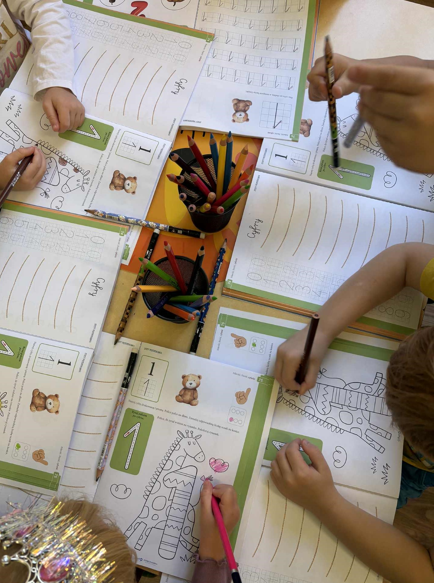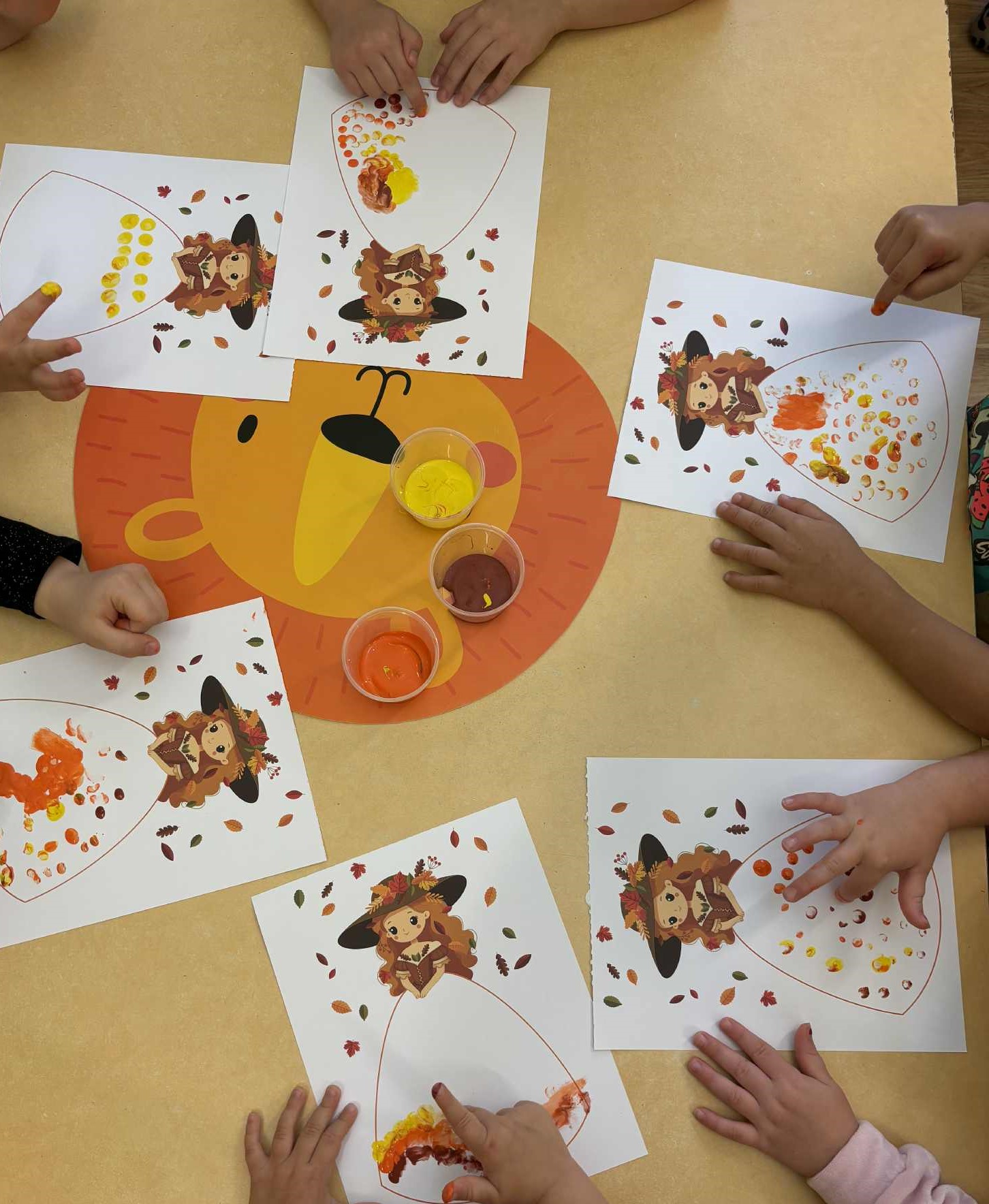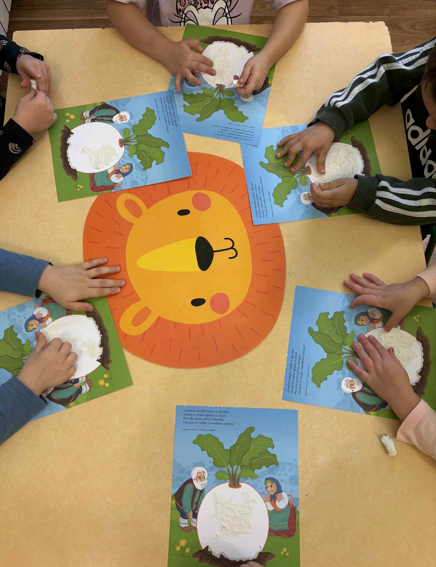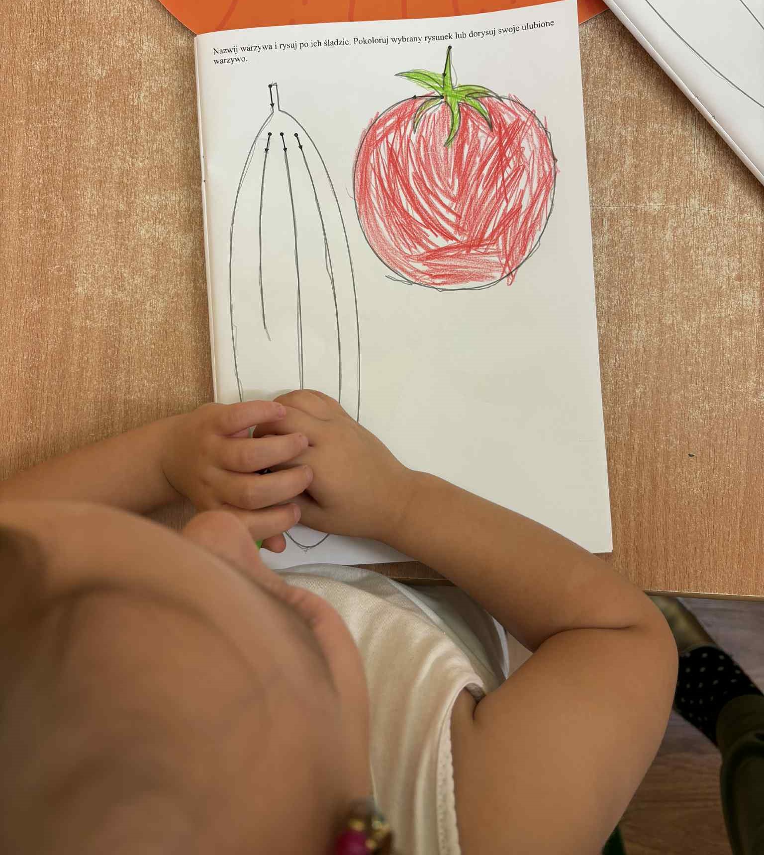 W pierwszym tygodniu października w naszej grupie sporo się działo. Rozpoznawaliśmy i nazywaliśmy wybrane warzywa za pomocą wzroku, dotyku, smaku, zapachu, kształtu. Stworzyliśmy kącik warzywny z naszych przyniesionych warzyw i każdego dnia zjadaliśmy jedno, dwa warzywo do śniadania. Nie zabrakło ćwiczeń w kartach pracy grafomotorycznych, gdzie rysowaliśmy po śladzie, a następnie kolorowaliśmy dane warzywa. Poznaliśmy cyfrę 1 oraz literę A,a - chętne dzieci wymyślały wyrazy na podaną głoskę. Wykonaliśmy sporo prac plastycznych i technicznych, malowaliśmy farbami Panią Jesień, moczyliśmy nasze paluszki w farbie i staraliśmy robić się na jej sukience odciski. Stworzyliśmy bakłażana z fioletowej farby (stemplowaliśmy farbą), a ogonek zrobiliśmy z plasteliny. Wykonaliśmy też rzepę, każdy z nas białą plasteliną rozcierał brakujące elementy warzywa.