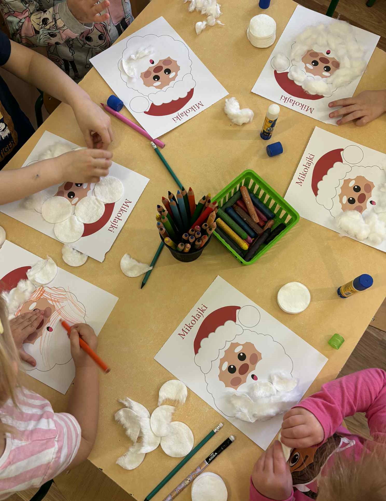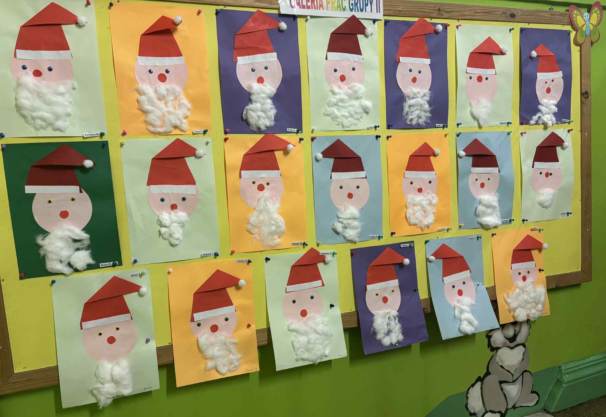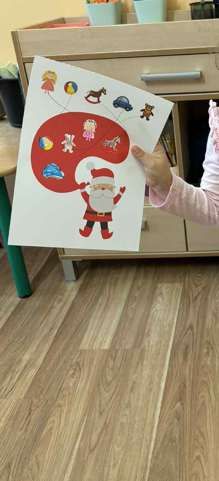 W pierwszym tygodniu grudnia nasza grupa poczuła już świąteczny klimat. Przy planszach edukacyjnych opisywała wygląd Świętego Mikołaja, opisywała jego charakterystyczne cechy. Wykonała prace plastyczną "Święty Mikołaj", do pracy dzieci wykorzystały czerwoną czapkę z papieru, kółka origami i watę. Pracowaliśmy również w książkach, gdzie wykonaliśmy ćwiczenia grafomotoryczne, uzupełnialiśmy karty pracy, łączyliśmy obrazki do cieni i watą udekorowaliśmy brodę Świętego Mikołaja. Bawiliśmy się też plastelinę, najpierw chętne dzieci lepiły bałwanki, a następnie cała grupa uzupełniania wybranym kolorem plasteliny puste pola na choince. Dla naszych wspaniałych rodziców robiliśmy zaproszenia na uroczystość choinką, dekorowaliśmy gwiazdkę naklejkami świątecznymi lub diamencikami. Oczywiście najfajniejszą atrakcją w tym tygodniu było wspólne ubieranie choinki !