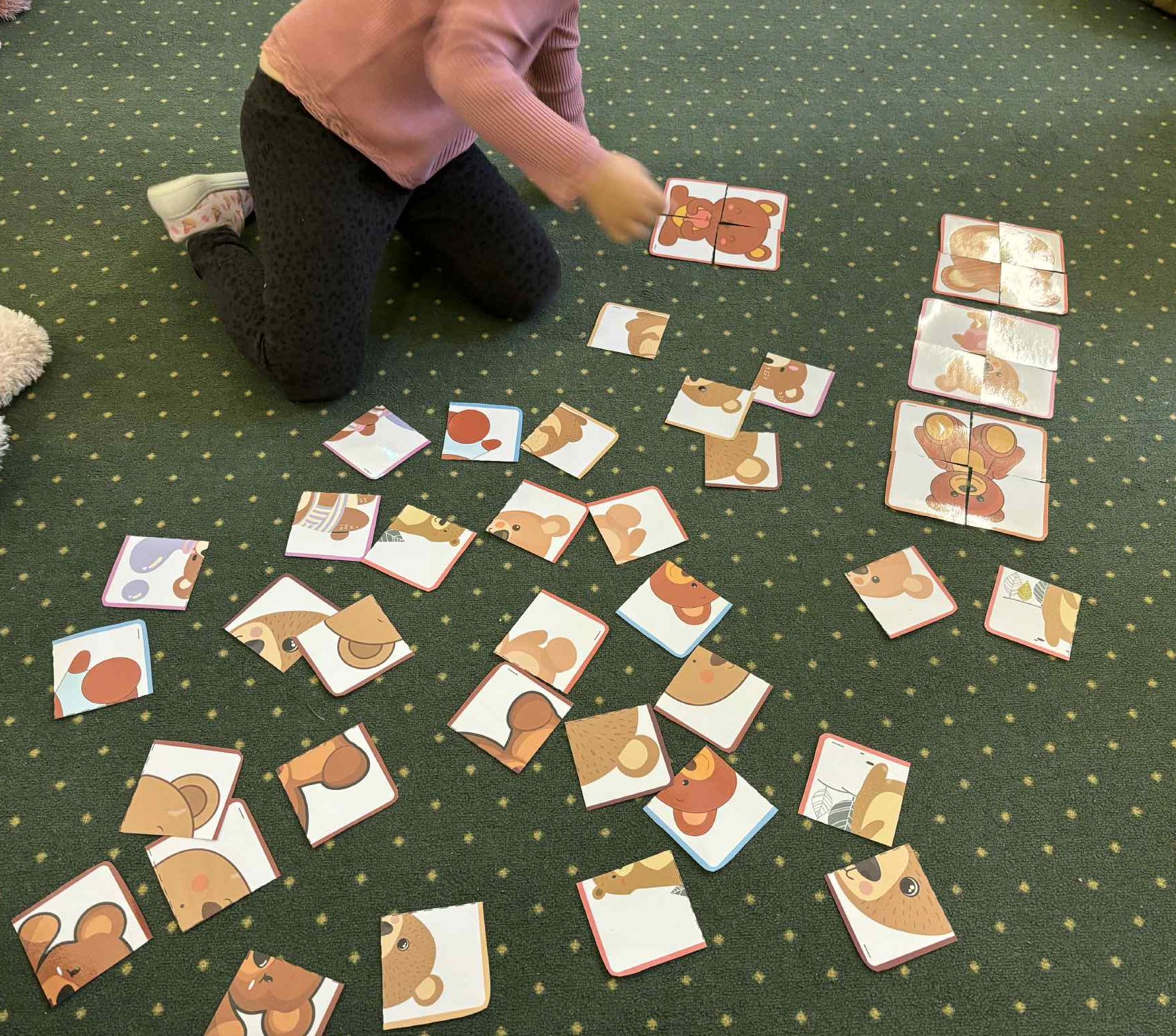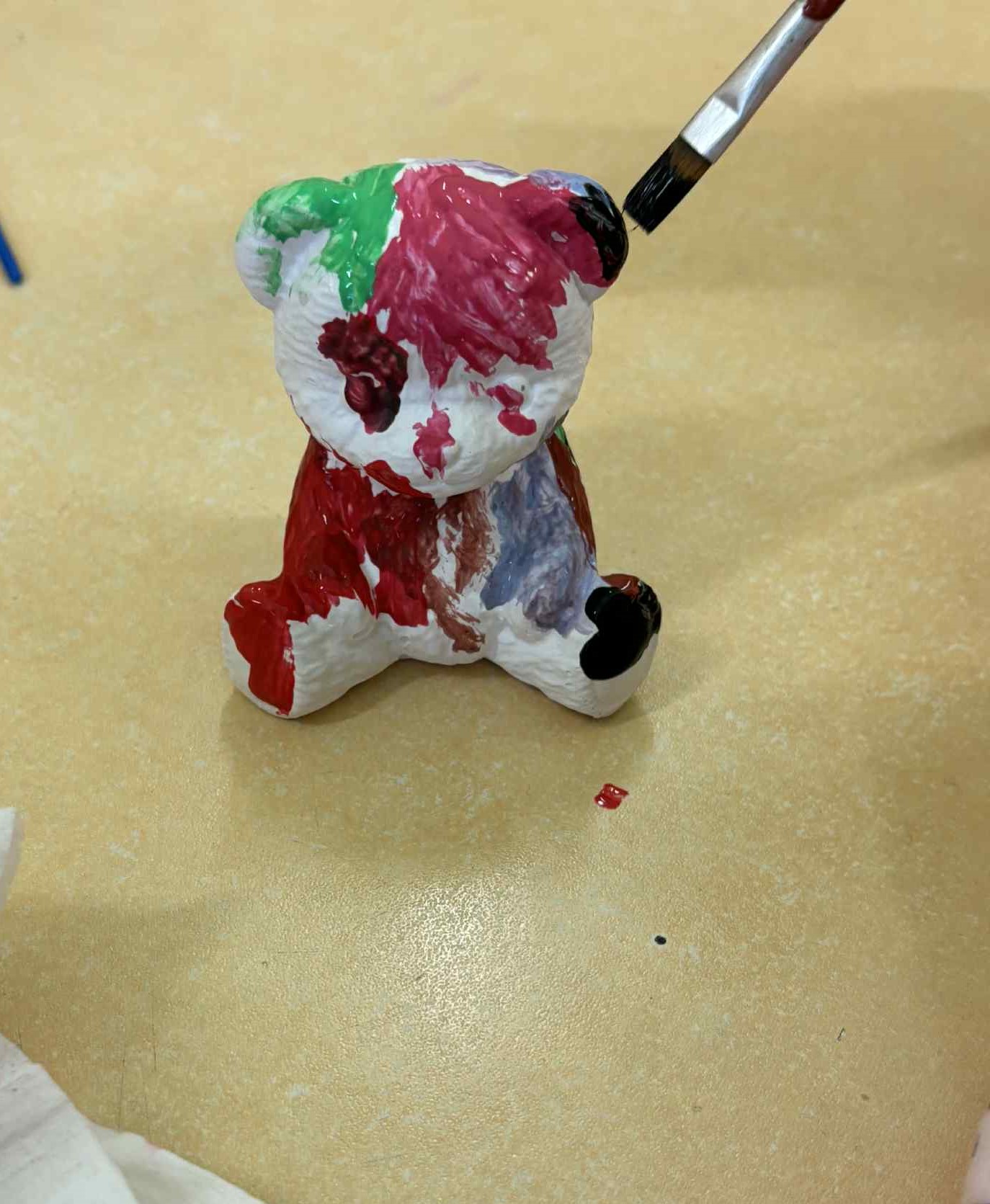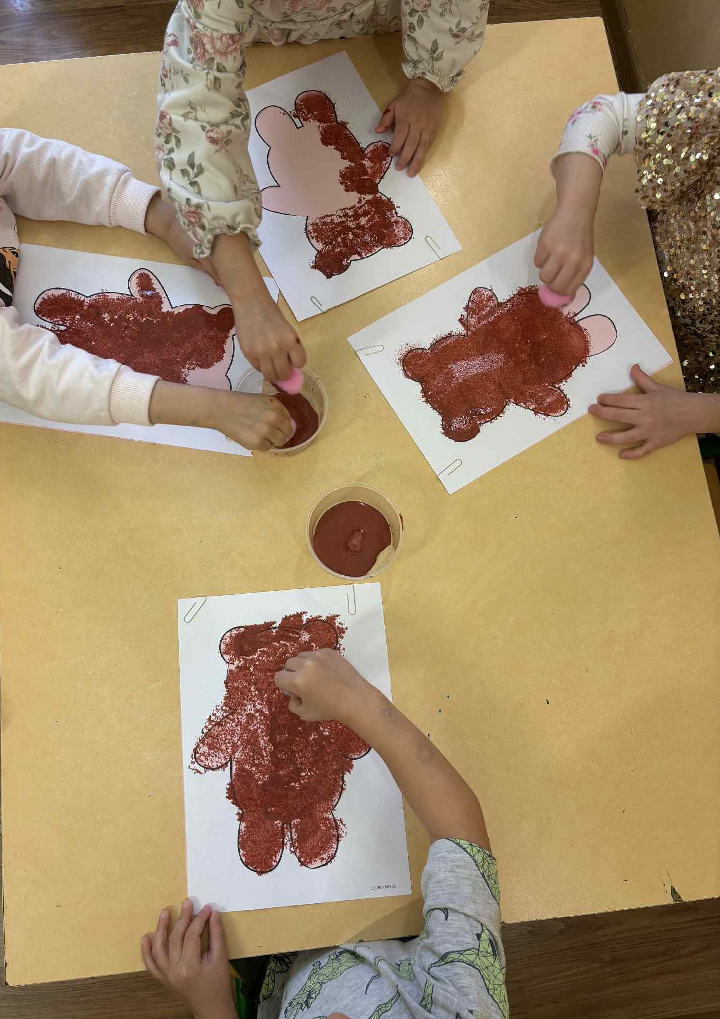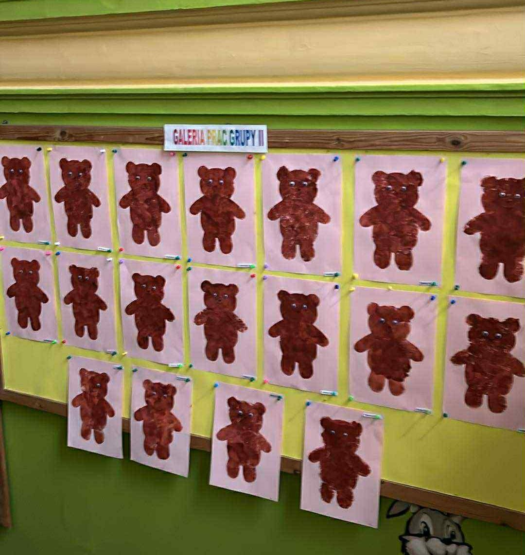 W ostatnim tygodniu listopada nasza grupa cały tydzień świętowała Dzień Misia. Dzieci opisywały wyglądu misia, wyszukiwały takich samych misi na obrazkach, wskazywały różnice w misiach oraz nauczyły się rymowanki o misiu Zuchu. Codziennie wykonywały jakąś prace plastyczną lub techniczną. Wykonaliśmy prace plastyczną pt: "Mój miś" stemplowaliśmy wycięty szablon misia pomponami, które moczyliśmy w brązowej farbie, następnie przyklejaliśmy ruchome oczy i rysowaliśmy czarnym mazakiem nosek i usta. Wykonaliśmy pacynkę misia, misia z rolki po papierze toaletowym oraz misia 3d . Do wszystkich tych prac były nam potrzebne nożyczki i kleje by móc wyciąć gotowe elementy i przyklejać je według polecenia naszych pań. Z okazji dnia misia dostaliśmy od naszych pań figurki misia, które pomalowaliśmy cienkim pędzlem wybraną przez nas farbą, niektórzy z nas pomalowaliśmy misie na barwne kolory !