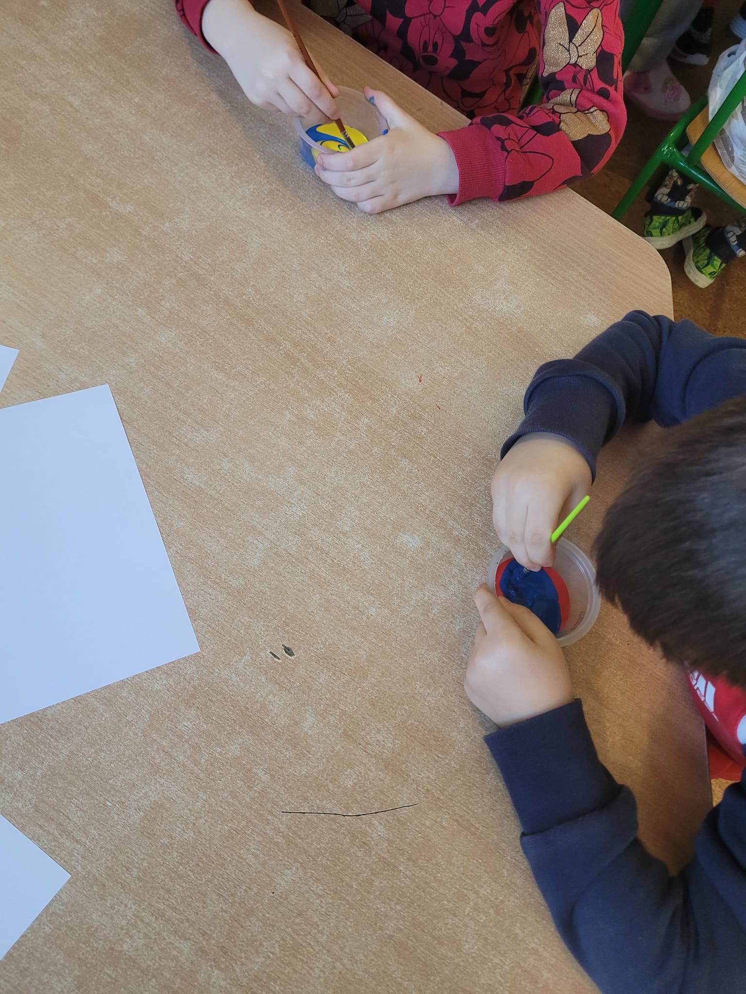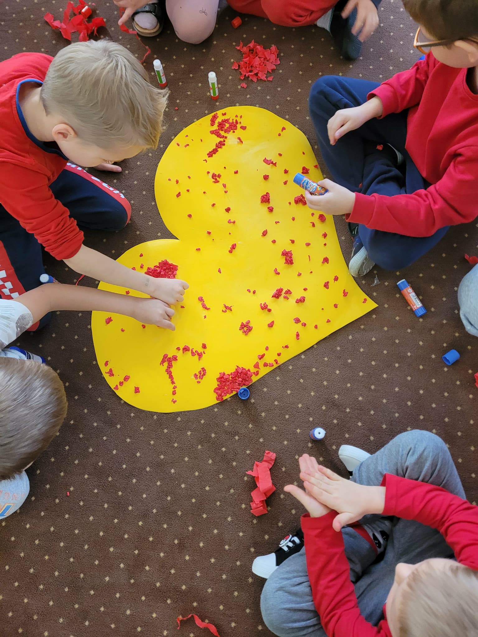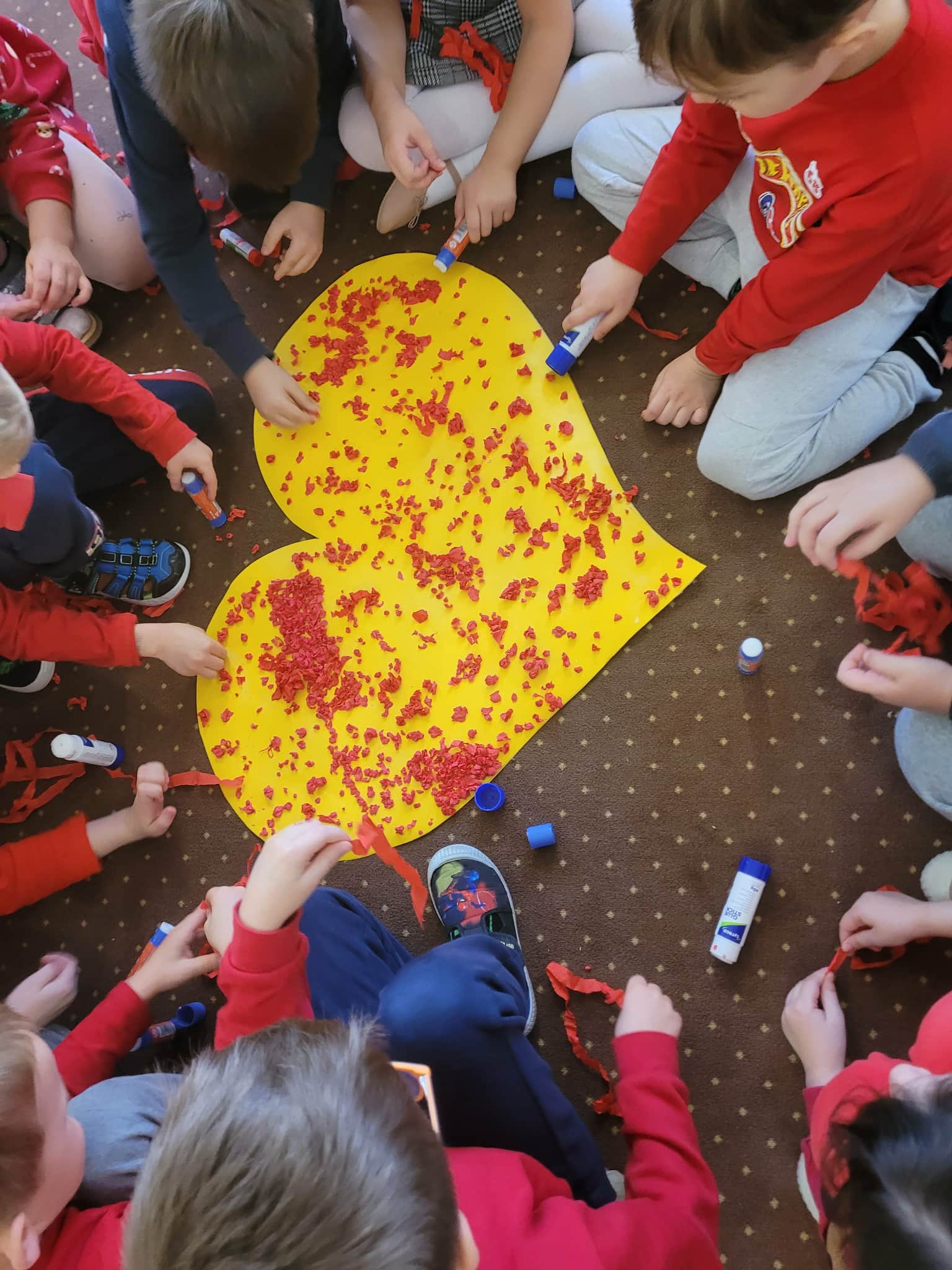Grupa wykonała 2. zadanie z projektu, który ma na celu pomóc dzieciom w rozpoznawaniu i rozumieniu emocji. Wysłuchaliśmy historii o emocji jaką jest "wzruszenie", odpowiadaliśmy na pytania stawiane do tekstu. Wykonaliśmy pracę grupową "serce wzruszeń" naklejając kulki z czerwonej bibuły na szablon serca. Ułożyliśmy własny układ taneczny, do spokojnej melodii, z szarfami. Wykonaliśmy zabawę plastyczną pt.: "Paleta uczuć"- dzieci mieszały dwa wybrane przez siebie kolory i tworzyły z nich dowolne rysunki.